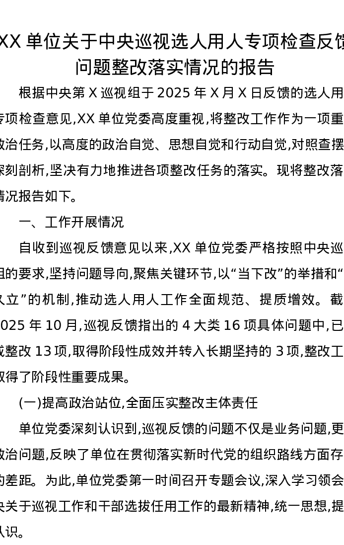 XX单位关于中央巡视选人用人专项检查反馈问题整改落实情况的报告