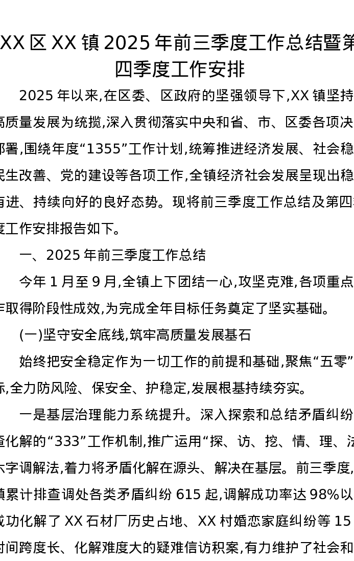 XX区XX镇2025年前三季度工作总结暨第四季度工作安排