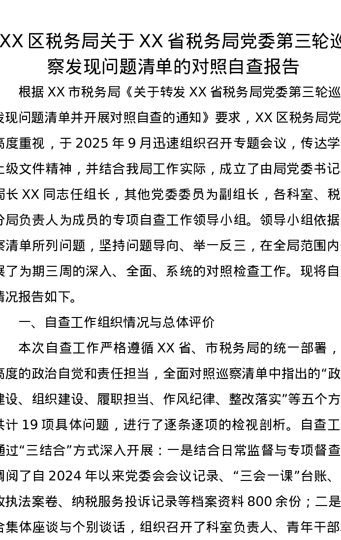 XX区税务局关于XX省税务局党委第三轮巡察发现问题清单的对照自查报告