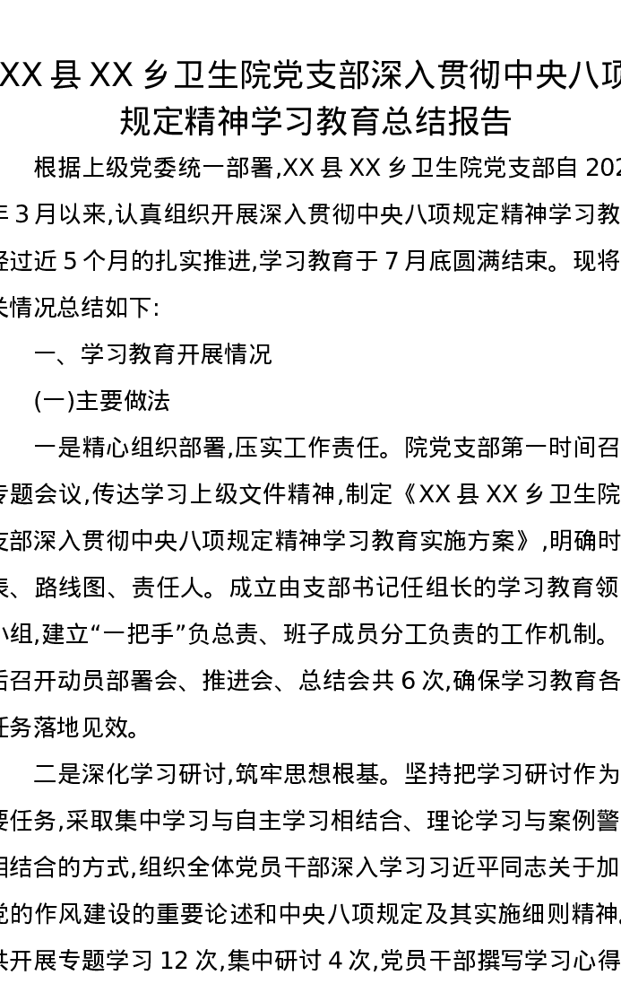 XX县XX乡卫生院党支部深入贯彻中央八项规定精神学习教育总结报告