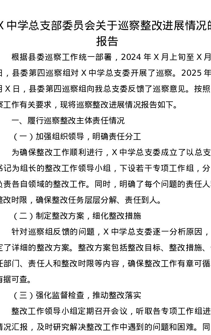 X中学总支部委员会关于巡察整改进展情况的报告