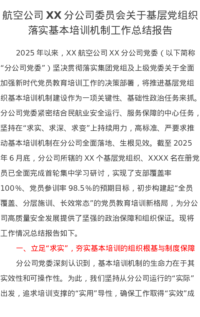 航空公司XX分公司委员会关于基层党组织落实基本培训机制工作总结报告