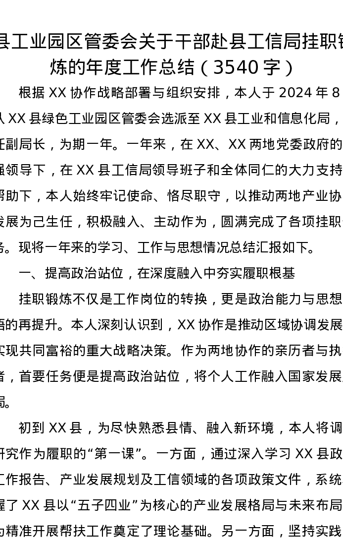 县工业园区管委会关于干部赴县工信局挂职锻炼的年度工作总结(3540字)