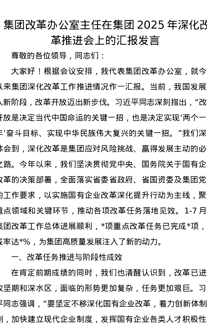 集团改革办公室主任在集团2025年深化改革推进会上的汇报发言