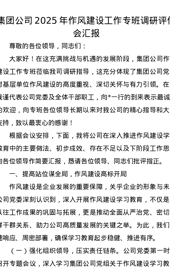 集团公司2025年作风建设工作专班调研评估会汇报