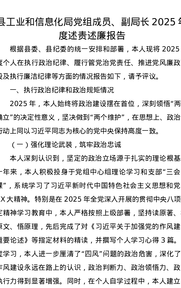 县工业和信息化局党组成员、副局长2025年度述责述廉报告