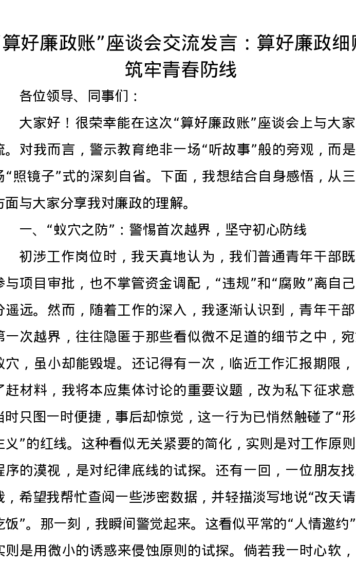 “算好廉政账”座谈会交流发言:算好廉政细账,筑牢青春防线