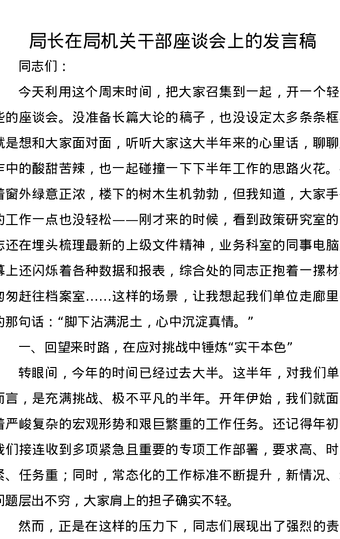 局长在局机关干部座谈会上的发言稿