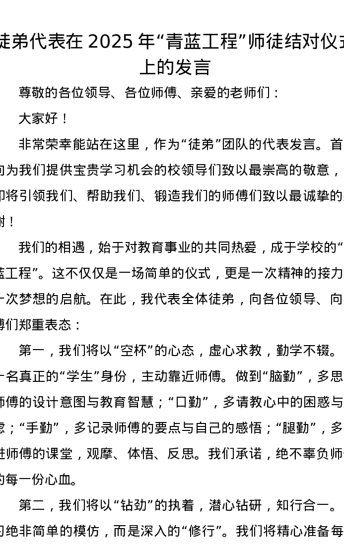 徒弟代表在2025年“青蓝工程”师徒结对仪式上的发言