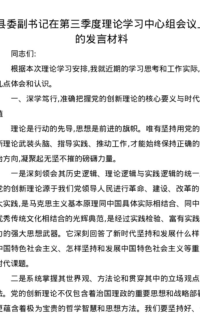 县委副书记在第三季度理论学习中心组会议上的发言材料