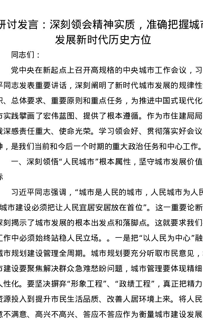 研讨发言:深刻领会精神实质,准确把握城市发展新时代历史方位