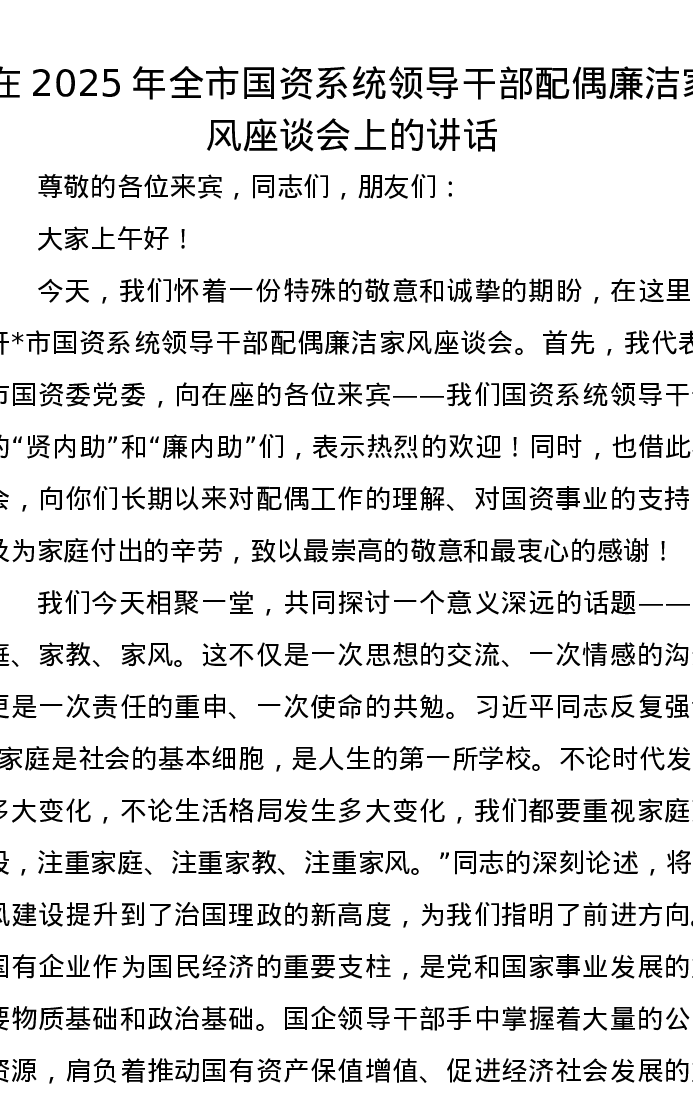 在2025年全市国资系统领导干部配偶廉洁家风座谈会上的讲话