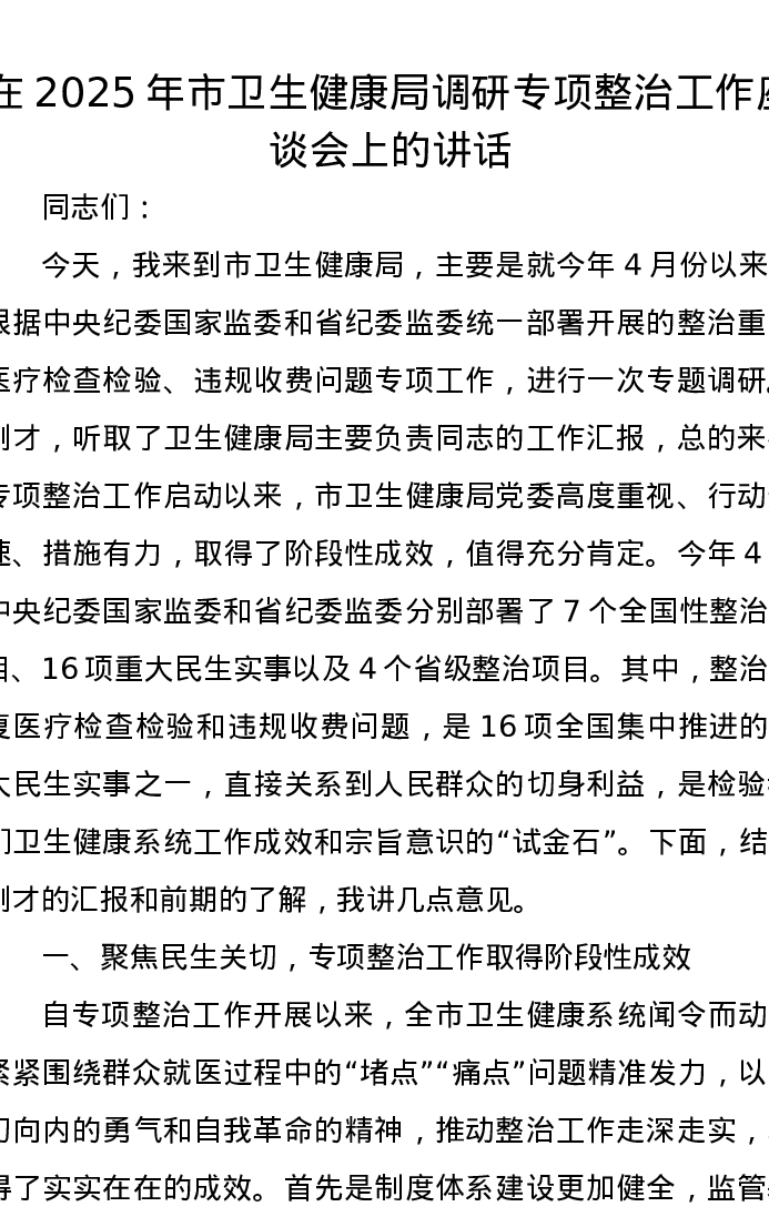 在2025年市卫生健康局调研专项整治工作座谈会上的讲话