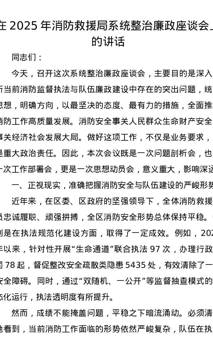 在2025年消防救援局系统整治廉政座谈会上的讲话