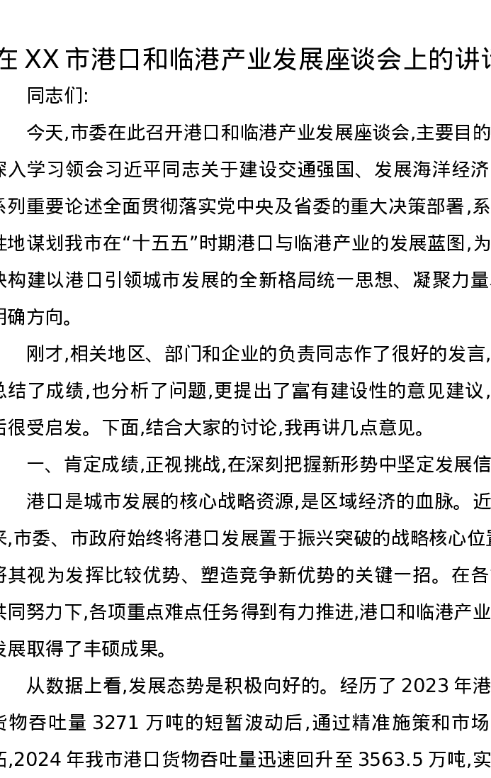 在XX市港口和临港产业发展座谈会上的讲话