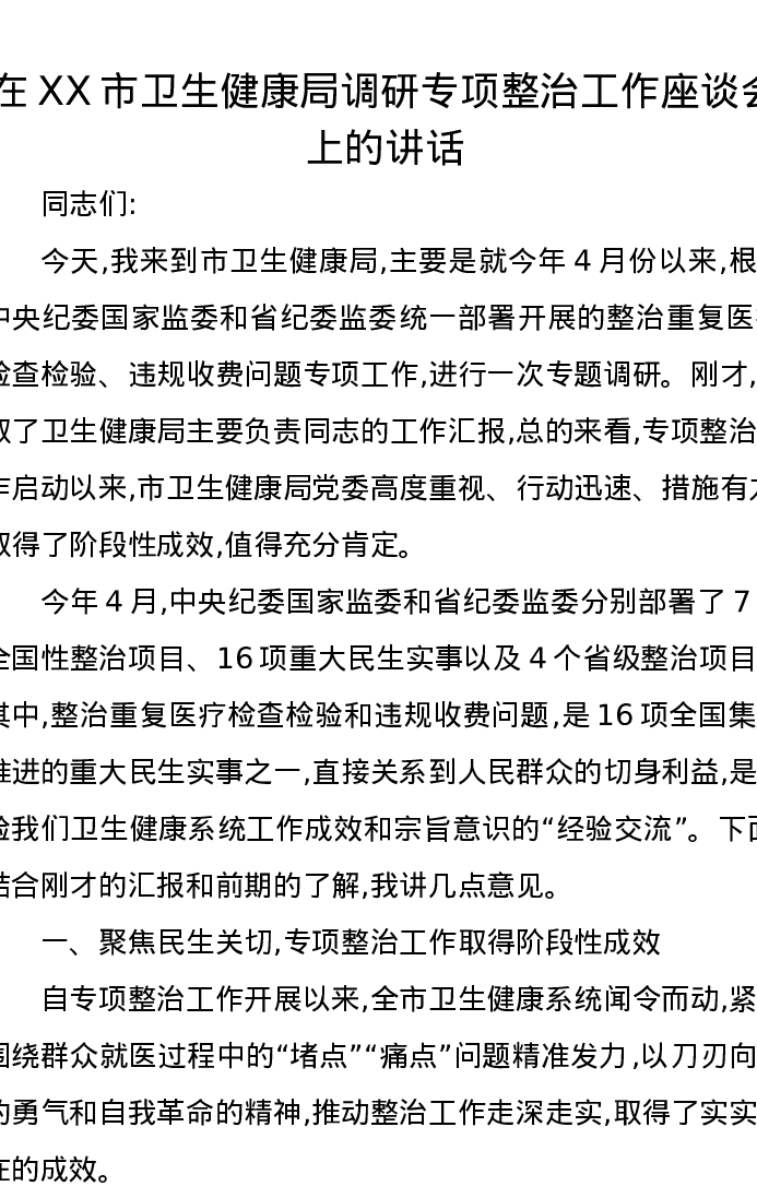 在XX市卫生健康局调研专项整治工作座谈会上的讲话