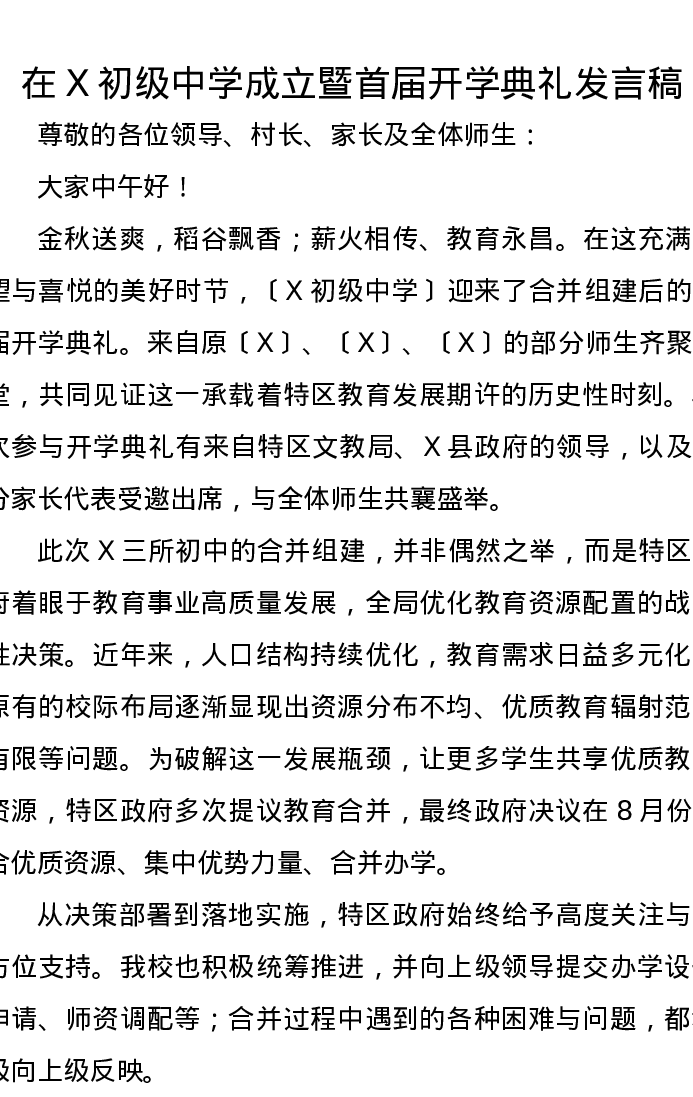 在X初级中学成立暨首届开学典礼发言稿