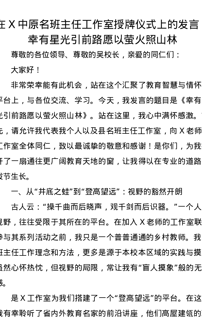 在X中原名班主任工作室授牌仪式上的发言:幸有星光引前路愿以萤火照山林