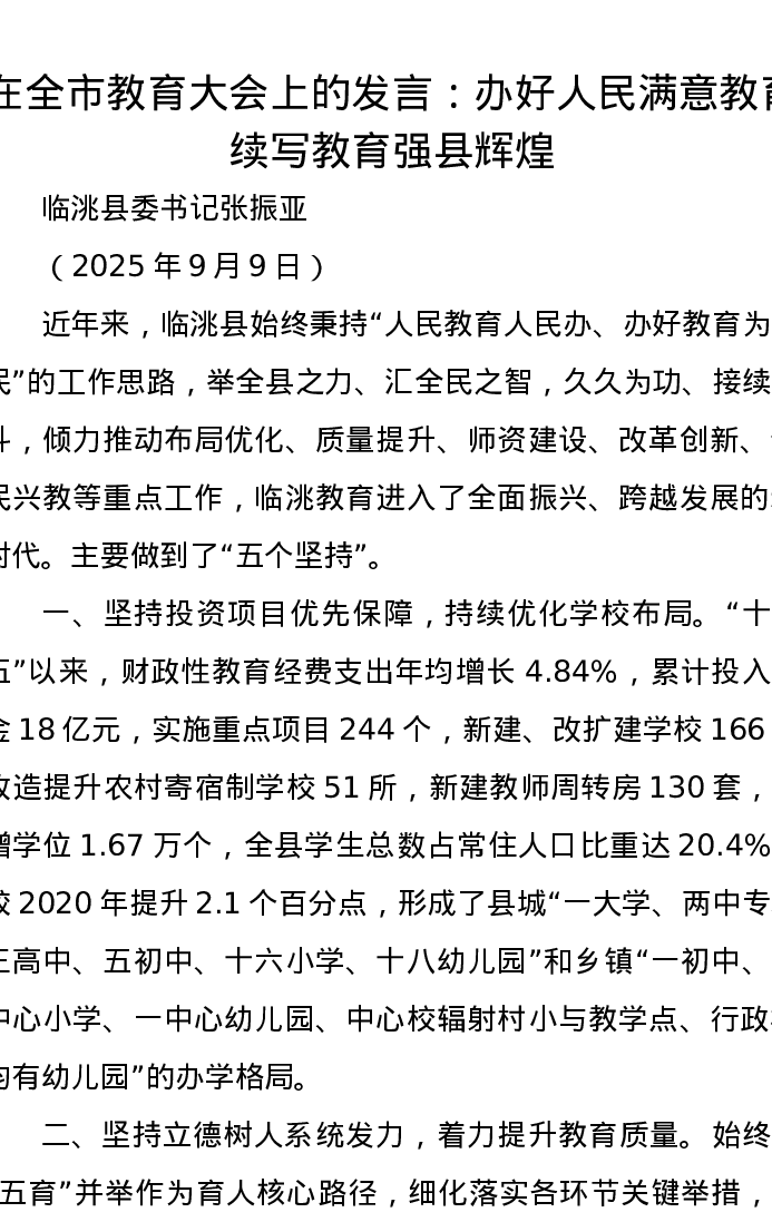 在全市教育大会上的发言:办好人民满意教育续写教育强县辉煌