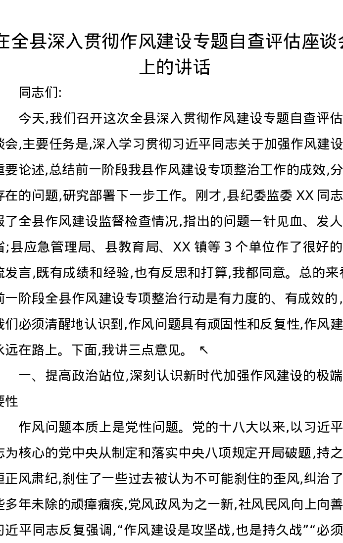 在全县深入贯彻作风建设专题自查评估座谈会上的讲话