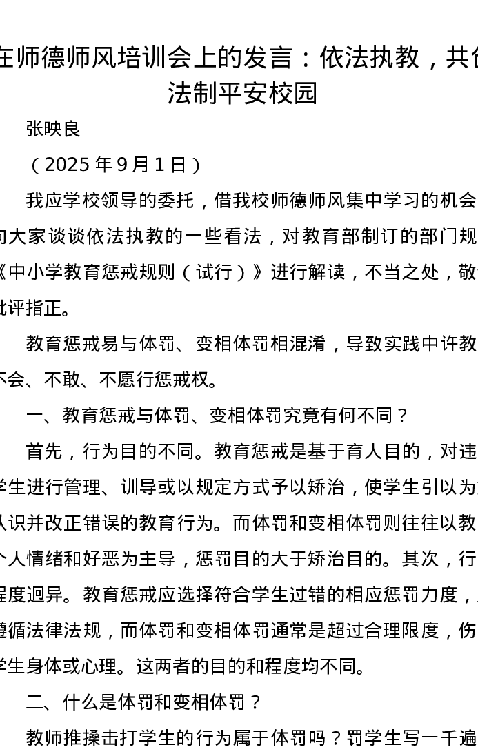 在师德师风培训会上的发言:依法执教,共创法制平安校园