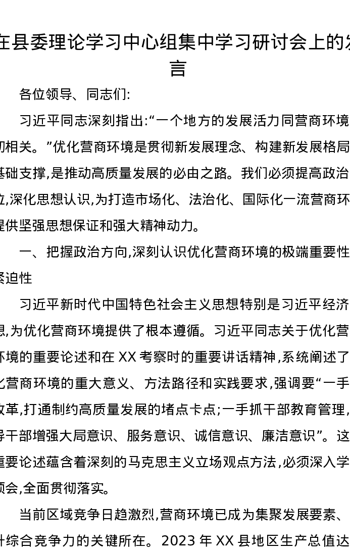 在县委理论学习中心组集中学习研讨会上的发言