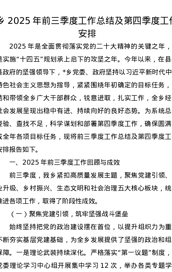 乡2025年前三季度工作总结及第四季度工作安排