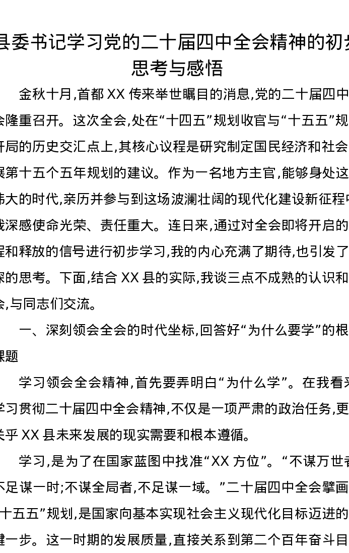 县委书记学习党的二十届四中全会精神的初步思考与感悟心得体会