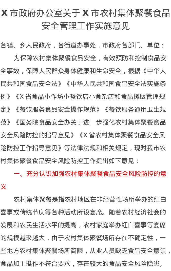 X市政府办公室关于X市农村集体聚餐食品安全管理工作实施意见