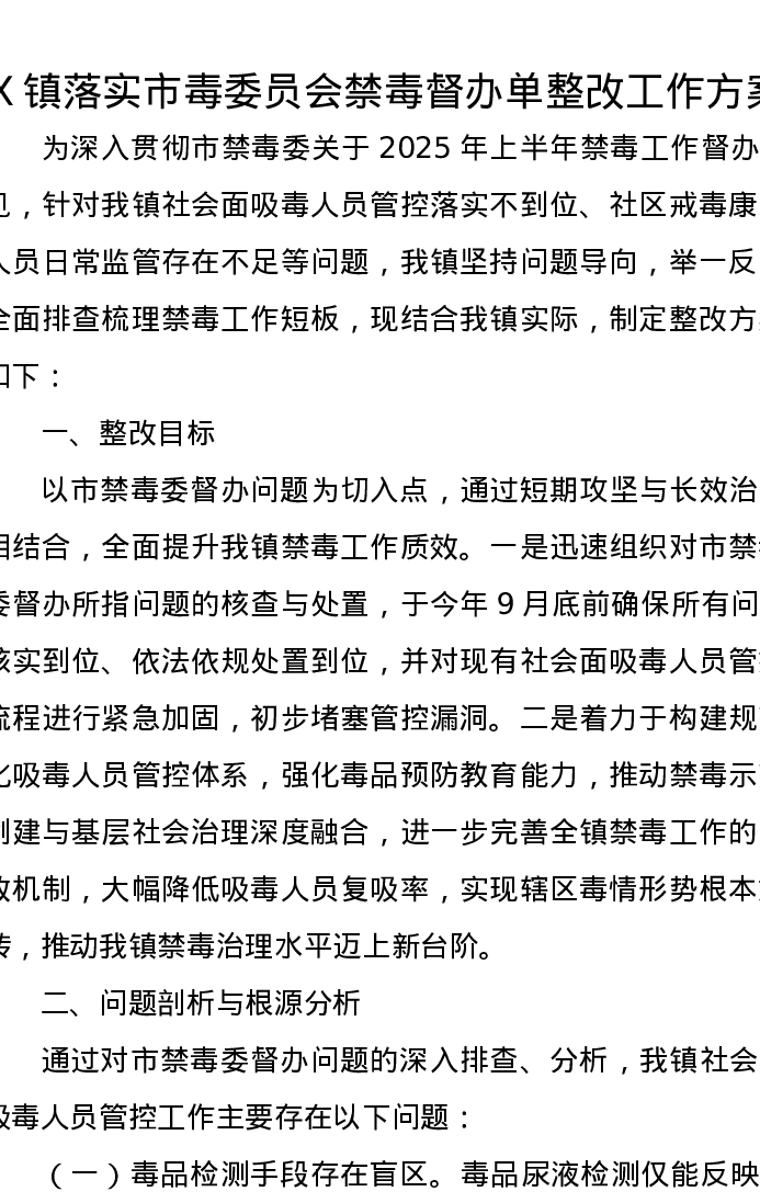 X镇落实市毒委员会禁毒督办单整改工作方案