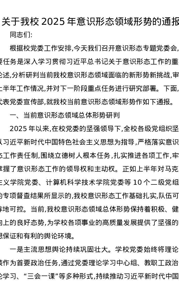 关于我校2025年意识形态领域形势的通报
