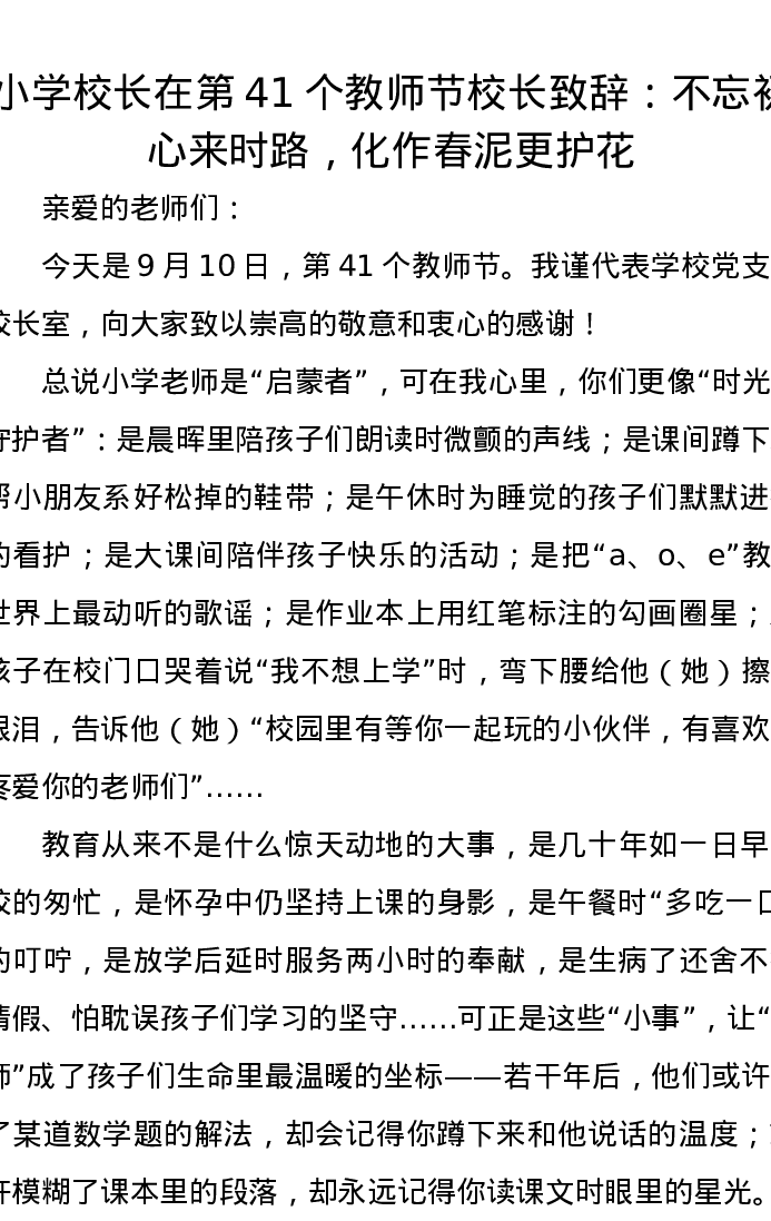 小学校长在第41个教师节校长致辞:不忘初心来时路,化作春泥更护花