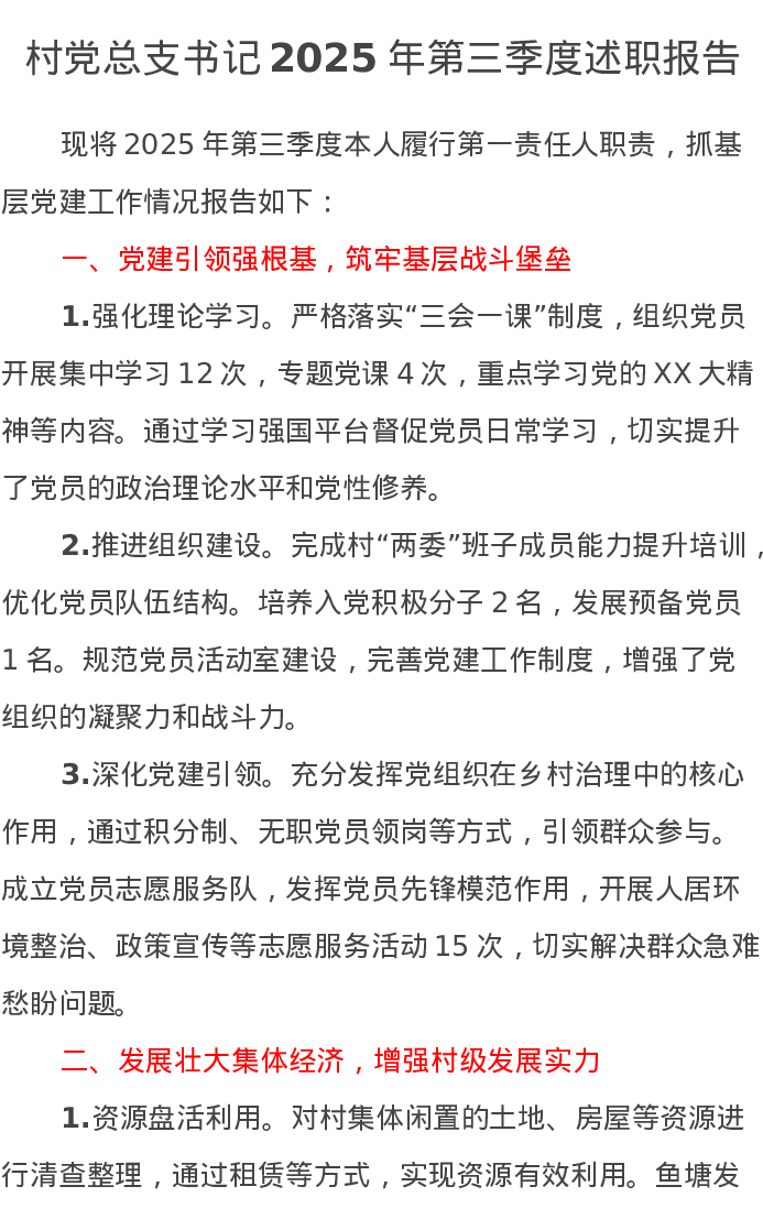 村党总支书记2025年第三季度述职报告