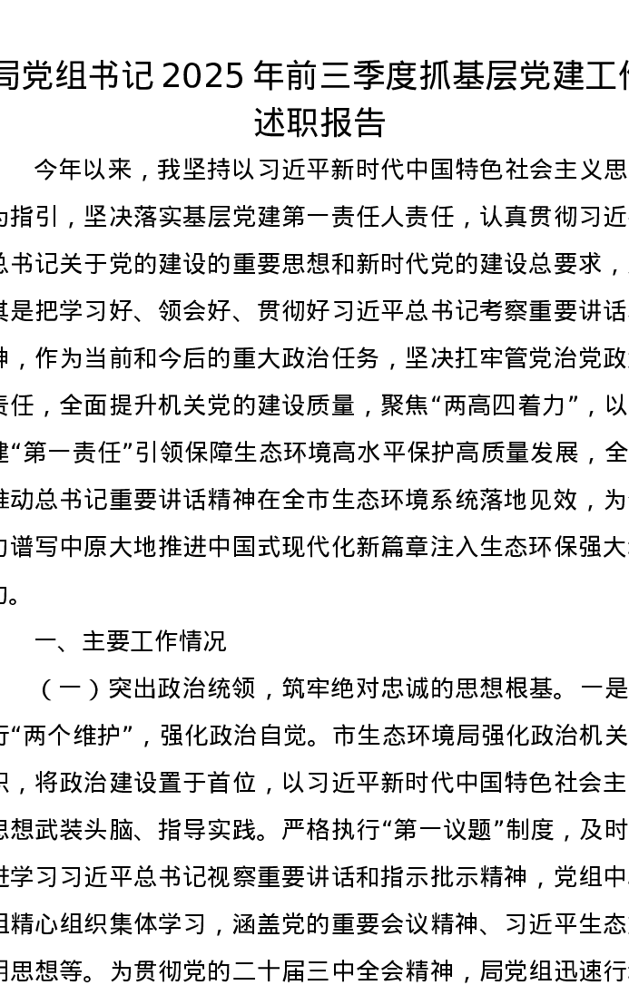 局党组书记2025年前三季度抓基层党建工作述职报告