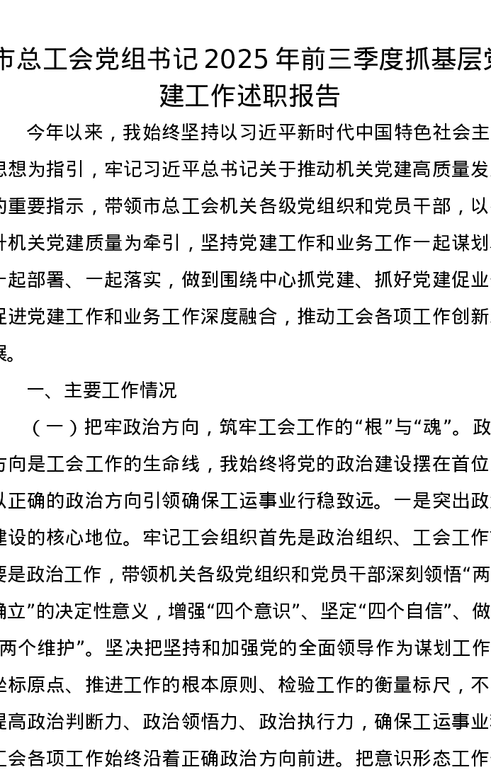 市总工会党组书记2025年前三季度抓基层党建工作述职报告