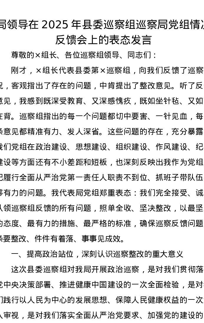 局领导在2025年县委巡察组巡察局党组情况反馈会上的表态发言