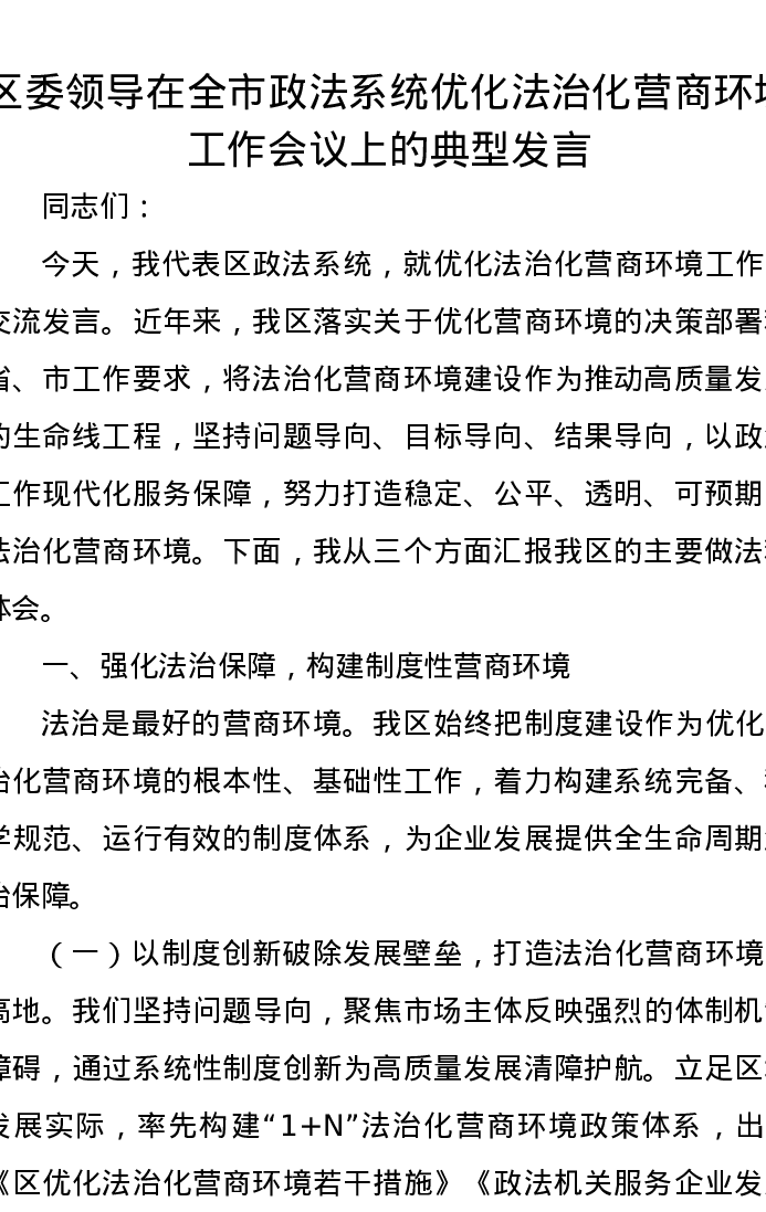 区委领导在全市政法系统优化法治化营商环境工作会议上的典型发言