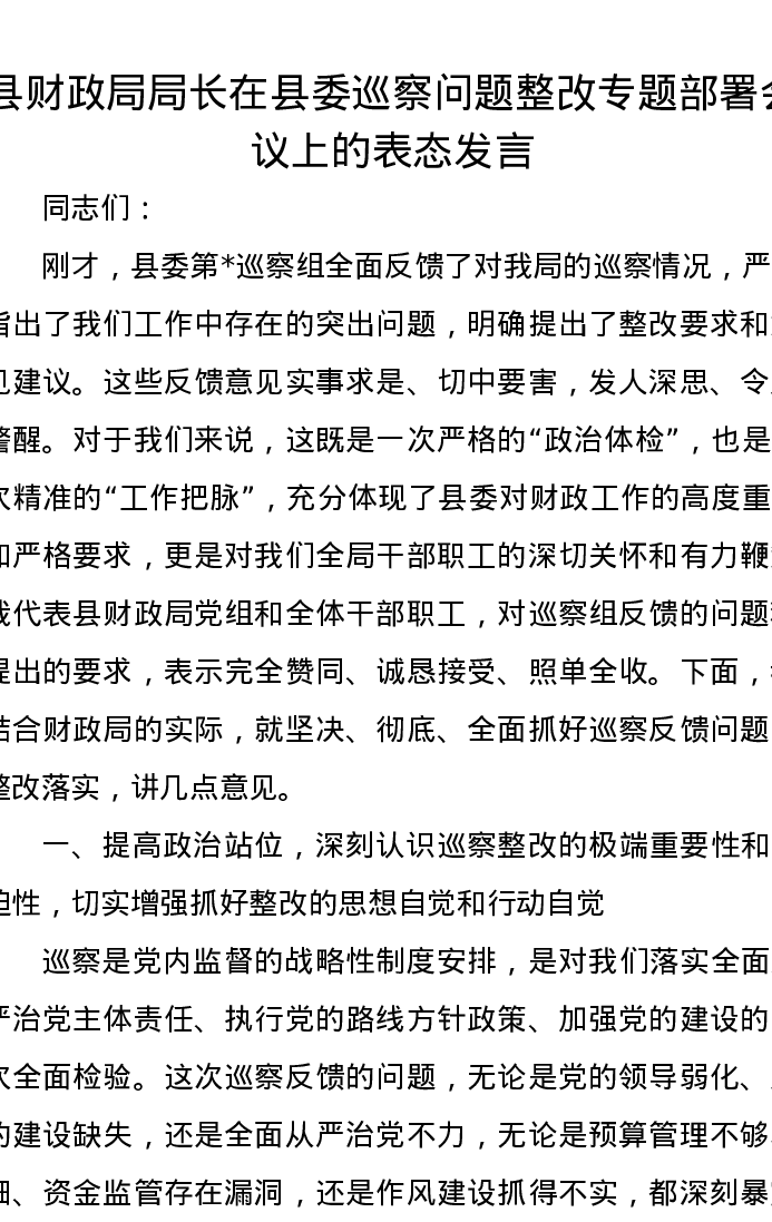 县财政局局长在县委巡察问题整改专题部署会议上的表态发言