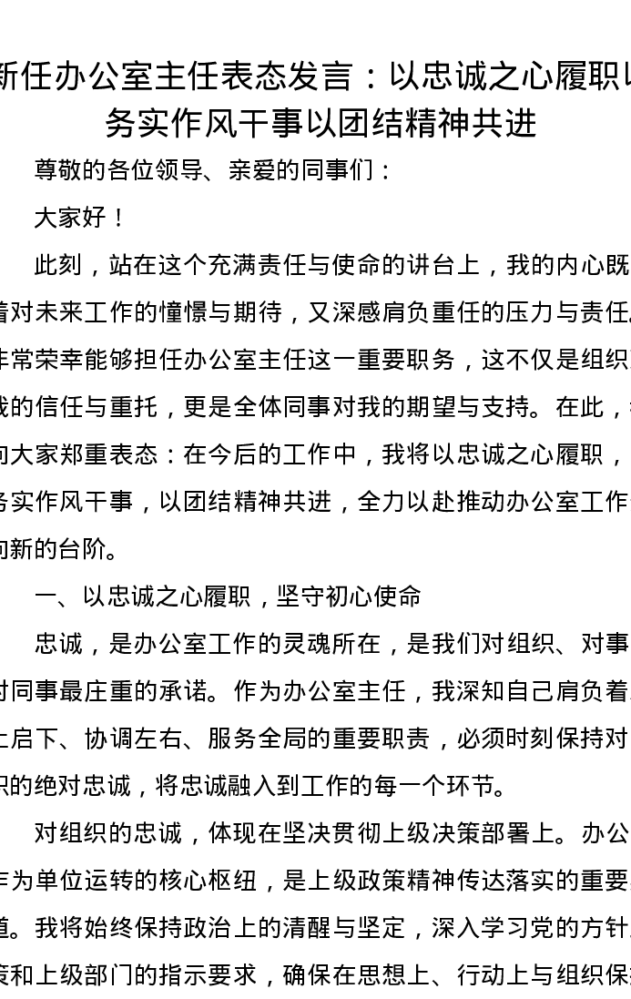 新任办公室主任表态发言:以忠诚之心履职以务实作风干事以团结精神共进