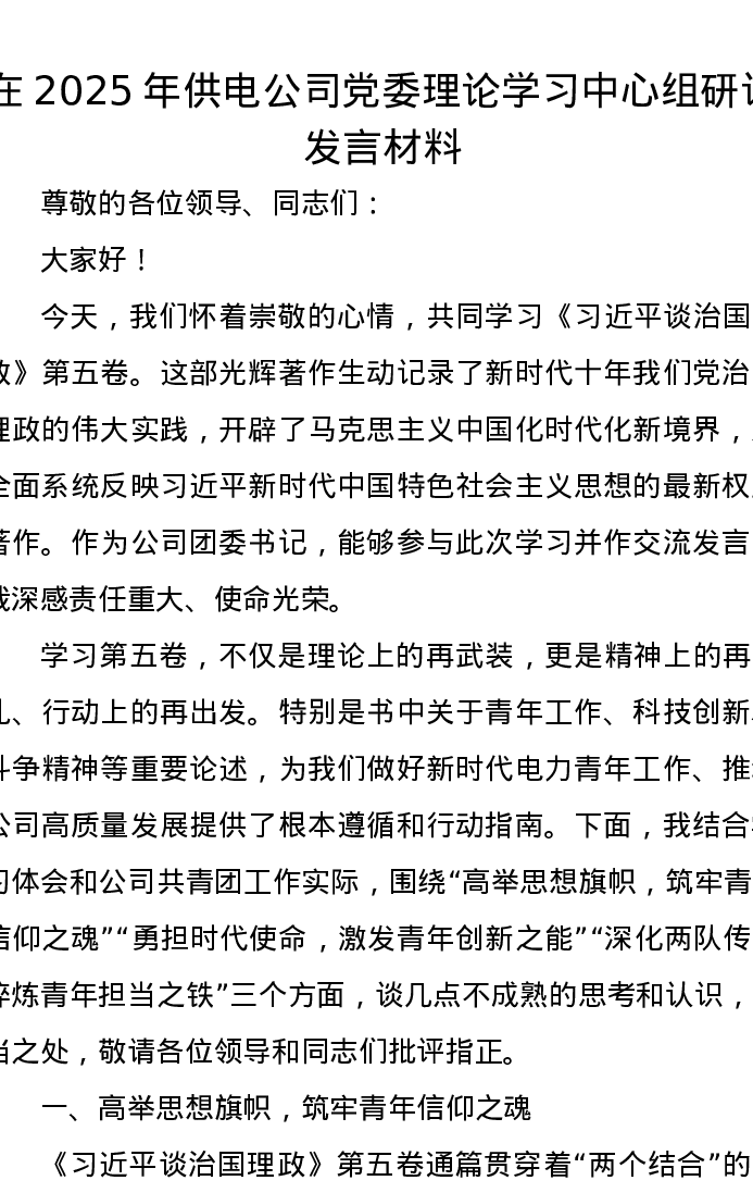 在2025年供电公司党委理论学习中心组研讨发言材料