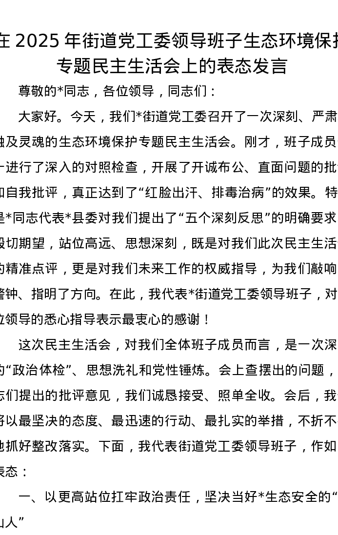 在2025年街道党工委领导班子生态环境保护专题民主生活会上的表态发言