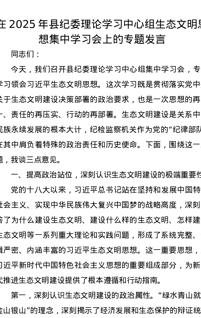在2025年县纪委理论学习中心组生态文明思想集中学习会上的专题发言
