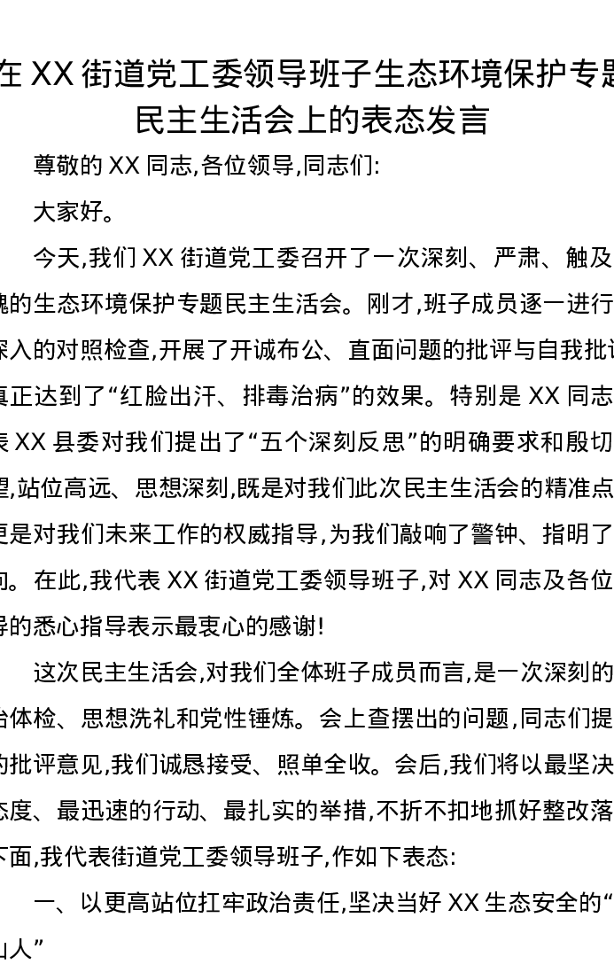 在XX街道党工委领导班子生态环境保护专题民主生活会上的表态发言