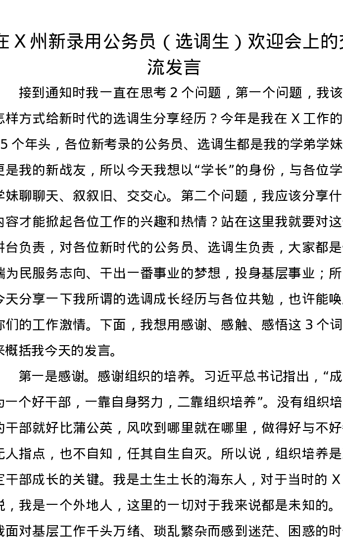 在X州新录用公务员(选调生)欢迎会上的交流发言