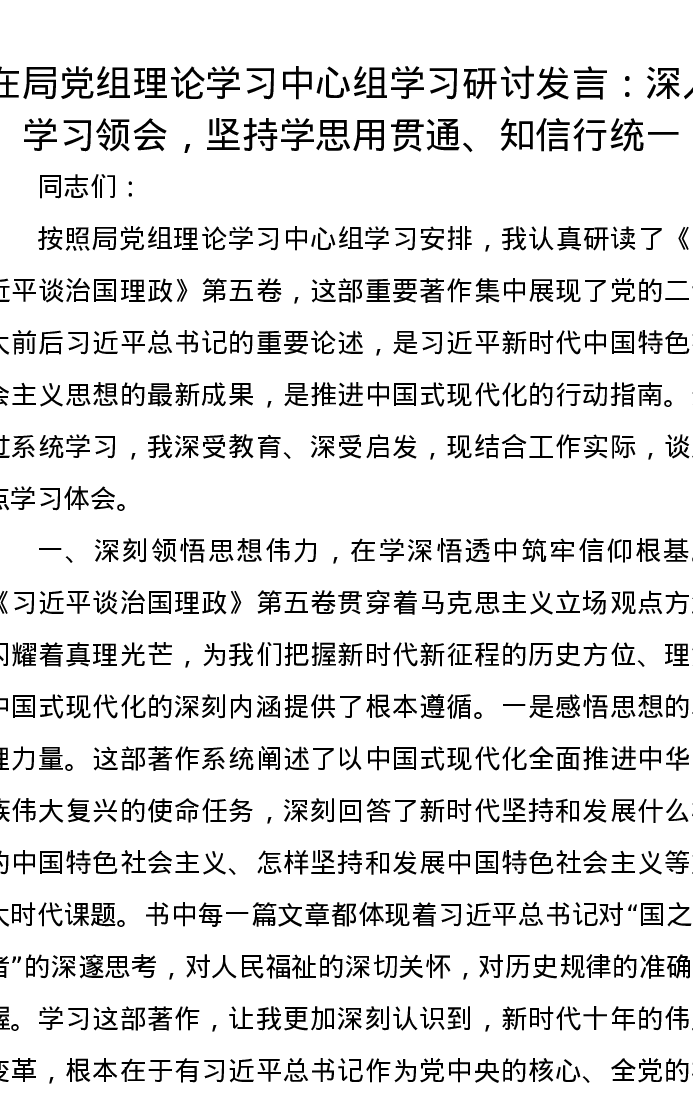 在局党组理论学习中心组学习研讨发言:深入学习领会,坚持学思用贯通、知信行统一