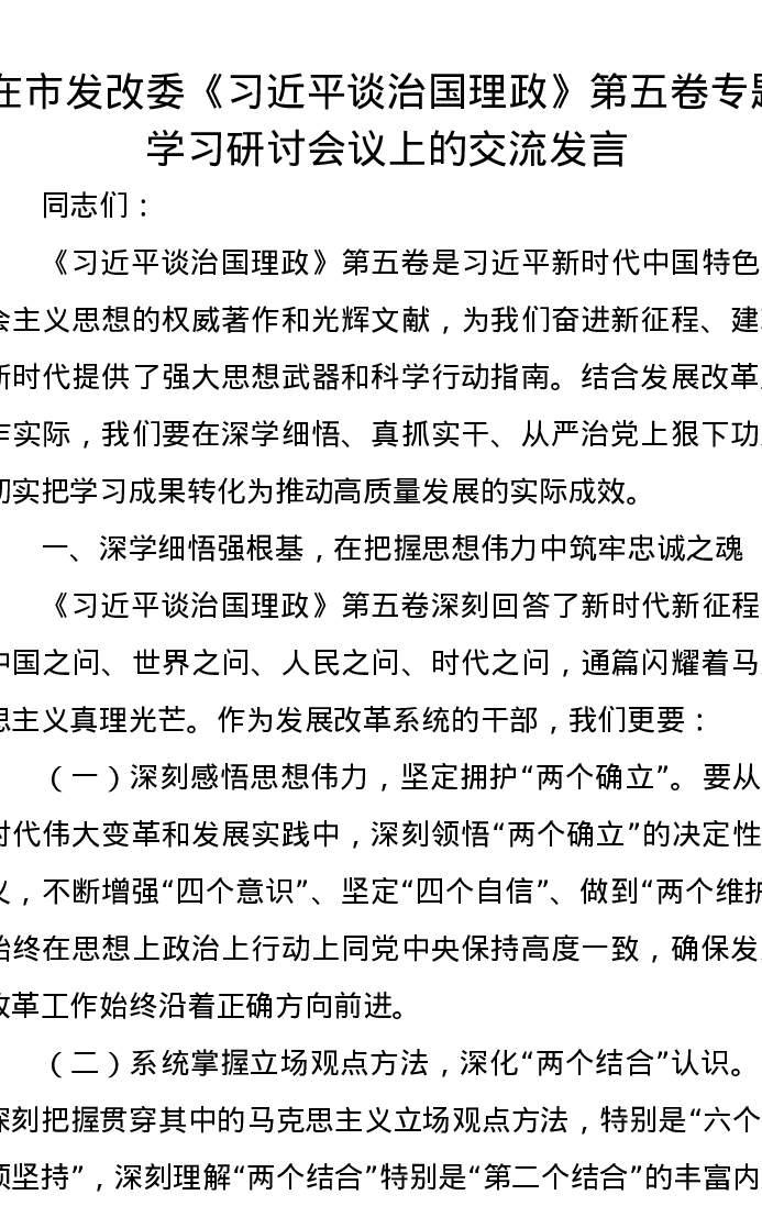在市发改委《习近平谈治国理政》第五卷专题学习研讨会议上的交流发言