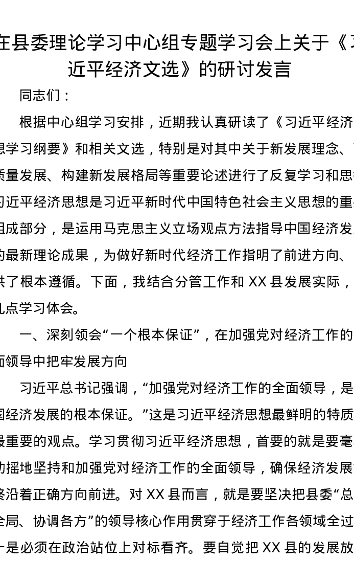 在县委理论学习中心组专题学习会上关于《习近平经济文选》的研讨发言