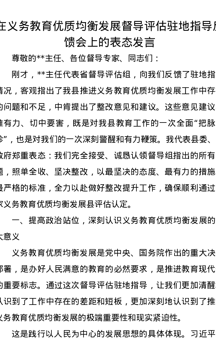 在义务教育优质均衡发展督导评估驻地指导反馈会上的表态发言