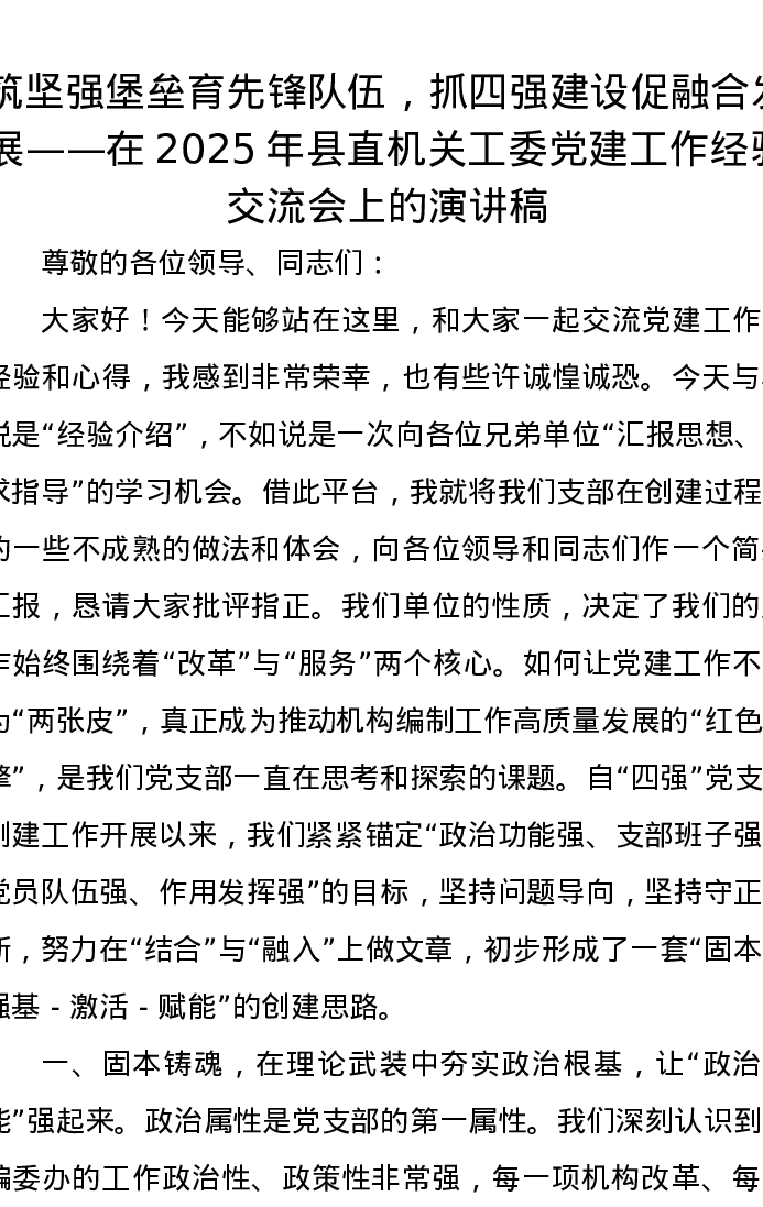 筑坚强堡垒育先锋队伍,抓四强建设促融合发展——在2025年县直机关工委党建工作经验交流会上的演讲稿