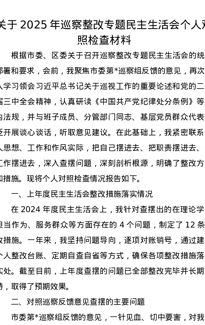 关于2025年巡察整改专题民主生活会个人对照检查材料